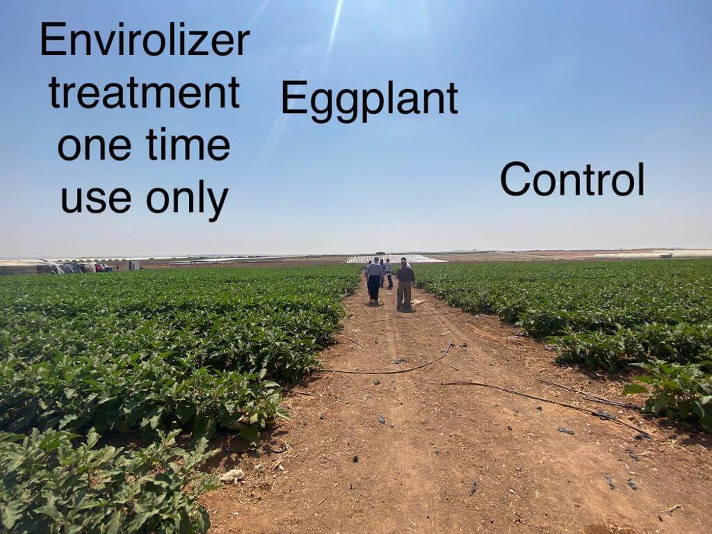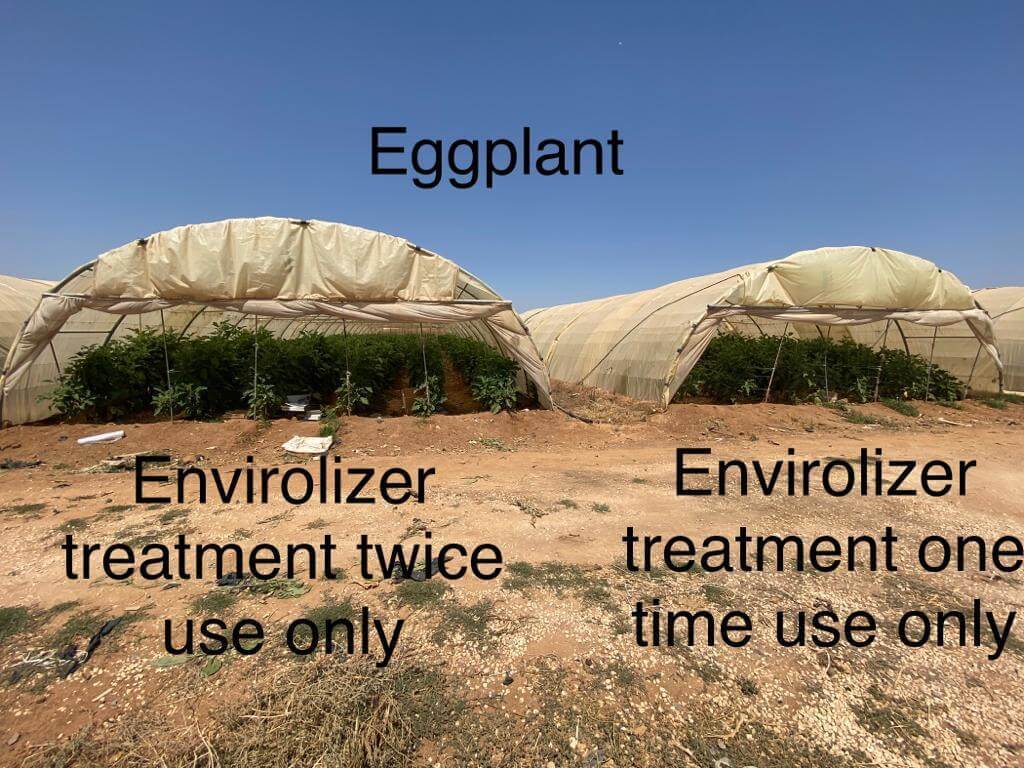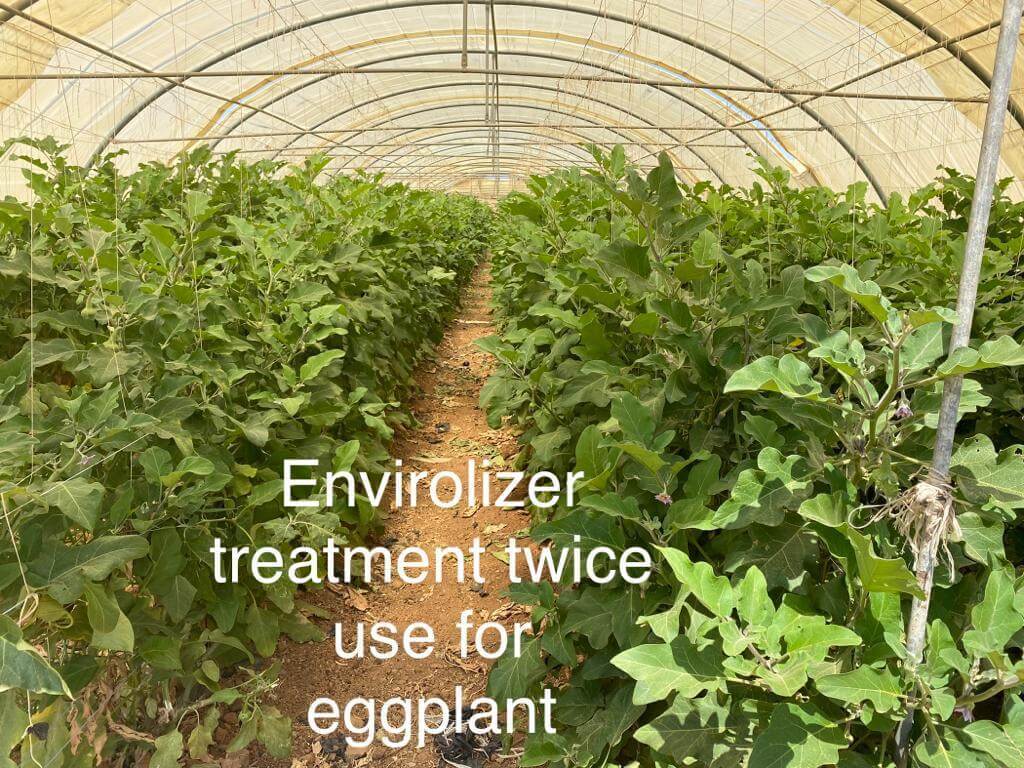 - Eggplant, Tomato, Cucumber: the company used one to two applications depending on the situation and the health of the plant, the application was 200g per 1000 m2 which means 400gm/Envirolizer mixed with 200L/water: the result after using the Envirolizer was amazing comparing with the control trial for the quality and quantities leaves, fruits, roots and resistance to powdery mildew.